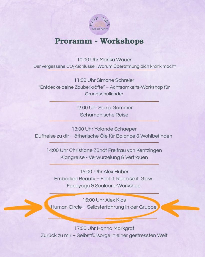 Beim Event hast Du auch die Gelegenheit mich und meine Angebote genauer kennenzulernen. Komm bei meinem Stand vorbei oder schnuppere in meine Selbsterfahrungsgruppe ,,Human Circle“ hinein: