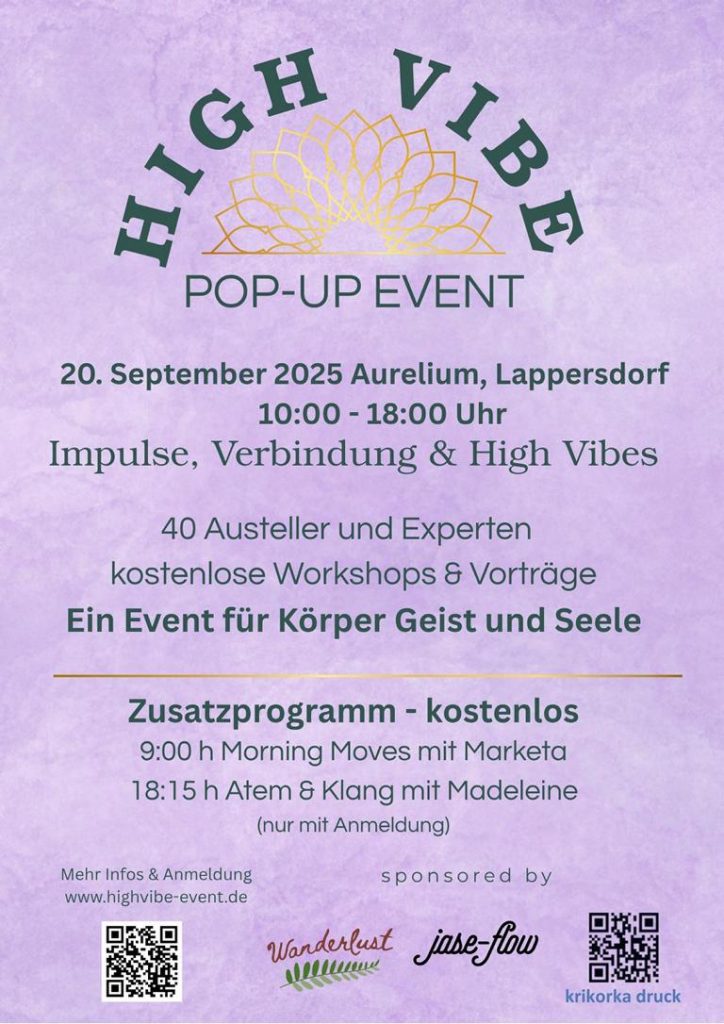 Ich war beim ,,High Vibe – Pop up Event“ im Aurelium in Lappersdorf am 20.09.25 als Aussteller und Workshopanbieter mit dabei. Dieses Event fand zum ersten Mal statt. Die Besucher fanden dort eine große Auswahl an Ständen, Workshops und Vorträgen zu verschiedensten, vordergründig alternativen Ansätzen für ganzheitliche Gesundheit und körperliches bzw. seelisches Wohlbefinden.